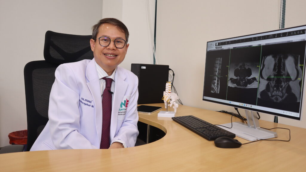 อย่างไรก็แล้วแต่ แม้เทคโนโลยีการรักษาจะก้าวหน้า แต่การป้องกันยังเป็นสิ่งสำคัญที่สุด คุณหมอวรพจน์แนะนำว่า การดูแลกระดูกสันหลังเริ่มต้นได้จากพฤติกรรมง่าย ๆ ในชีวิตประจำวันก้มยกของให้ถูกวิธี ด้วยการใช้แรงจากขาและสะโพกแทนการงอหลัง อย่ายกของเกินกำลัง ผู้ชายไม่ควรเกิน 30 กิโลกรัม ผู้หญิงไม่เกิน 20 กิโลกรัม หลีกเลี่ยงการนั่งกับพื้นหรือนั่งเตี้ย ๆ เพราะทำให้หลังรับแรงกดมาก นั่งหลังตรงเมื่อทำงานหรือขับรถ ปรับพนักพิงให้อยู่ในแนวธรรมชาติของหลังพักเบรกทุก 1 ชั่วโมง หากต้องนั่งนานออกกำลังกายสม่ำเสมอ เพื่อเสริมกล้ามเนื้อหลังและแกนกลางลำตัวให้แข็งแรง สุดท้ายคือ ต้องออกกำลังกายครับ เพราะการออกกำลังกายช่วยได้ทุกอย่าง”